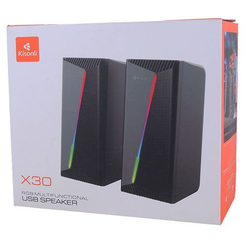 اسپیکر دو تکه سیمی کیسونلی مدل Kisonli X30 یک سیستم صوتی رومیزی دو تکه سیمی از برند محبوب کیسونلی یک محصول باکیفیت و با صدایی واضح می باشد که برای استفاده با کامپیوتر، لپ تاپ، موبایل و تبلت طراحی شده است. این اسپیکر با اتصال از طریق پورت USB برای تغذیه برق و ورودی AUX 3.5 میلی متری برای صدا سازگاری بالایی با انواع دستگاه ها دارد و بدون نیاز به منبع تغذیه جداگانه، به راحتی قابل استفاده است.
