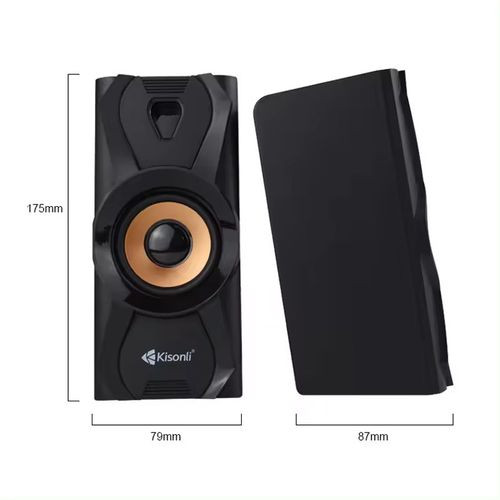 منبع تغذیه اسپیکر دو تیکه سیمی کیسونلی مدل Kisonli U-9003 پورت USB می باشد و ورودی صدا پورت 3.5 میلی متری یا همان AUX طراحی شده است. ابعاد هر باند 80x95x175 میلی متر می باشد. توان خروجی کلی این اسپیکر حدود 6 وات است (تقریباً 3 وات برای هر بلندگو) و قطر هر اسپیکر 52 میلی متر می باشد، که برای فضاهای کوچک تا متوسط مانند میز کار، اتاق خواب، دفتر کار یا محیط های آموزشی مناسب است و می تواند صدایی واضح با جزئیات کافی ارائه دهد. پاسخ فرکانسی بین 20 هرتز تا 20 کیلوبت ثانیه باعث می شود صدا در کل دامنه شنیداری انسان طبیعی و متعادل به گوش برسد — از بم های نرم گرفته تا صداهای تیز و واضح.