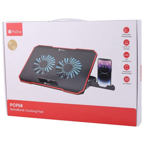 طراحی بسته بندی پایه خنک کننده لپتاپ پرووان مدل PCP58 با رنگ قرمز برند و سطح درخشان لوگو، بیشتر شبیه معرفی یک گجت حرفه ای است تا یک لوازم جانبی کامپیوتر ساده! با آنباکس جعبه این فن خنک کننده لپ تاپ، پایه ی مشکی با لبه های قرمز و سطح فلزی درخشانش نگاه را جلب می کند؛ کابل USB و دفترچه ی راهنما نیز با نظم خاصی درون محفظه های جداگانه قرار گرفته اند. این طراحی فقط زیبا نیست، بلکه به محافظت از محصول در جابه جایی هم کمک می کند. بدنه از ترکیب فلز و پلاستیک فشرده ساخته شده تا در عین استحکام، سبک و قابل حمل بماند. پایه های ضدلغزش، سطح شیب دار و وزن متعادل 840 گرمی باعث می شود کول پد روی میز کاملاً پایدار بماند. زاویه ی قابل تنظیم این کول پد نیز با هر نوع میز و قد کاربر هماهنگ می شود تا لپ تاپ درست در سطح چشم قرار گیرد و گردن و کمر در طول روز خسته نشوند. PCP58 بهترین پایه خنک کننده لپ تاپ برای کاربردهای متعدد محسوب می شود.